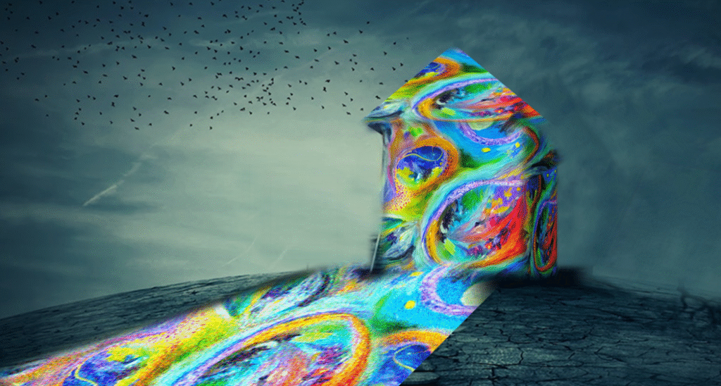 The installations create a symbiotic relationship between the interior and exterior space. When a house is empty, the outside world is just that-ordinary and unchanged. But as soon as people light up the walls, the patterns and colors of the paintings are reflected outside.
